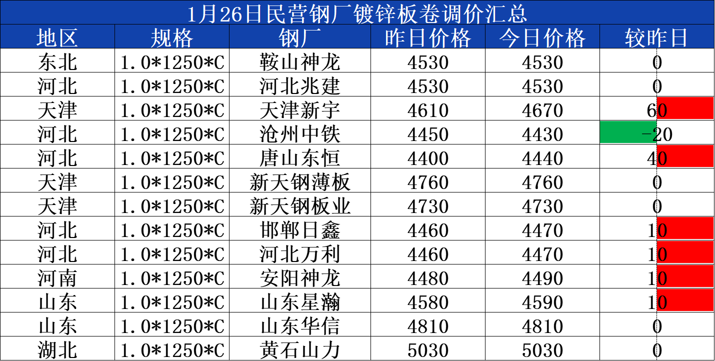 • 1月26日民营钢厂镀锌板卷调价汇总