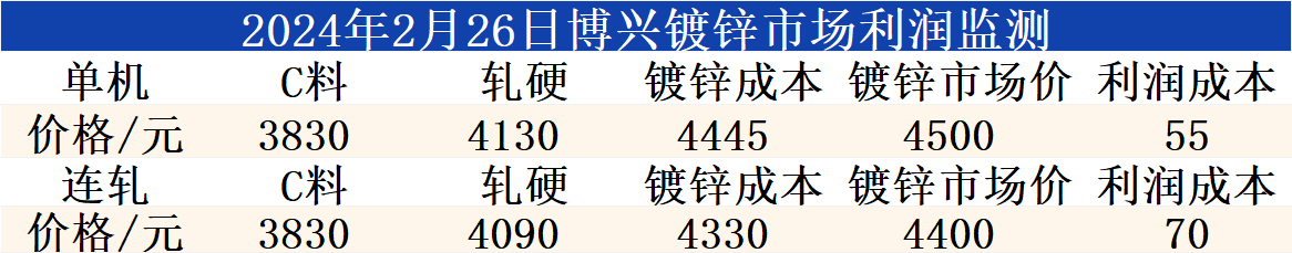 2月26日博兴镀锌市场利润监测