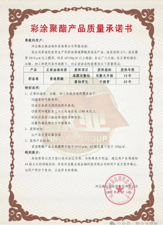 该项目要求产品涂料不掉漆、不粉化、颜色完整。敬业高端彩涂具有足锌层、足漆膜等特点,同等环境下能够大大增强彩板的耐腐性、强耐紫外线等性能,可以高标准满足客户需求。此外,所有产品均出具质保书,并承诺质保年限,保障客户权益。经过考察,敬业高端彩涂的产品质量以及售前、售后服务均获得了客户的高度认可,最终成功达成合作。