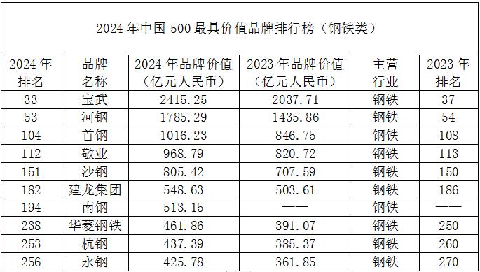 宝武、河钢、首钢等多家钢企入选2024年“中国500最具价值品牌榜”