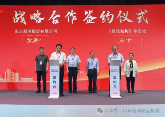 会上隆重举行了冠洲与《建筑结构》杂志社战略合作签约仪式。在全体嘉宾的见证下,冠洲宋总和王彬主编代表双方上台签约,任庆英大师、《建筑结构》杂志社编辑部主任时娇娇、张昭董事长、冠洲王总一同见签。