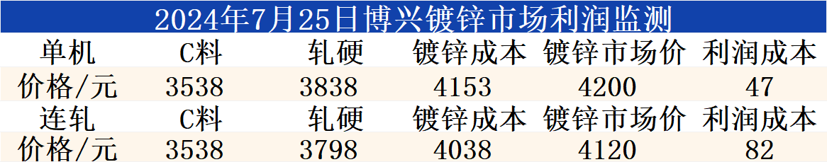 7月25日博兴镀锌市场利润监测