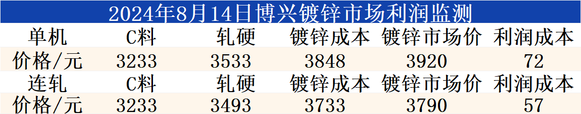 8月14日博兴镀锌市场利润监测