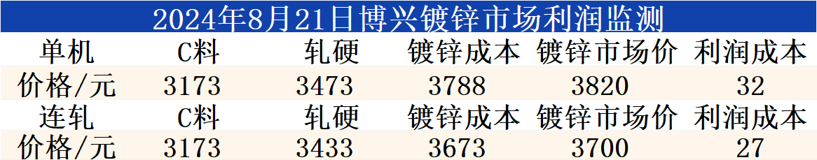 8月21日博兴镀锌市场利润监测