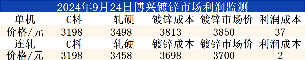 9月24日博兴镀锌市场利润监测