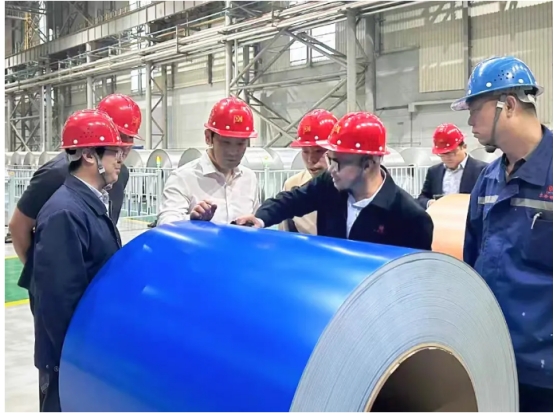 东钢冷轧销售二部部长王连臻及技术厂长李科学陪同参观了产线车间,详细介绍了我司的技术实力与生产能力。我们的生产线全部采用国外最先进的技术和装备,引进全套自动化控制系统,采用一体化控制技术和质量一贯制管理模式,可生产冷轧全硬卷板,冷轧退火卷板,冷轧镀锌卷板、镀铝锌卷板、锌铝镁卷板、彩涂卷板、彩涂印花卷板、水性“镁白”净化板专用彩涂卷板等产品。我们一直秉持绿色制造、智能制造、精品制造、精益制造以及精准服务的高质量发展路径,积极推广超低排放及管理经验技术,持续探索产业链减排的途径,减少钢铁产品全生命周期的碳排放总量,为行业树立标杆,为下游创造条件,为社会谋取福祉。