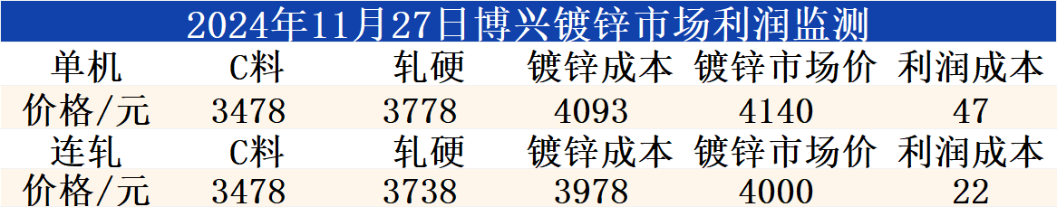 11月27日博兴镀锌市场利润监测