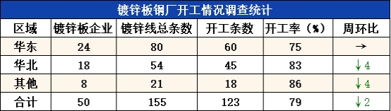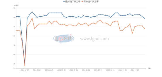 兰格调研:截至1月22日,我网对全国53家钢厂样本进行统计。其中镀锌板生产线共155条,停产或检修32条,开工率为79%,较上期下降2%,样本数据日均总产量镀锌板9.27万吨,较上期减少0.22万吨。彩涂板生产线共104条,停产或检修33条,开工率为68%,较上期下降3%,样本数据日均总产量彩涂板2.98万吨,较上周减少0.1万吨。