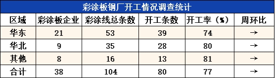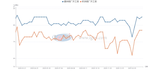 兰格调研:截至3月5日,我网对全国53家钢厂样本进行统计。其中镀锌板生产线共155条,停产或检修24条,开工率为85%,较上期上升1%,样本数据日均总产量镀锌板9.76万吨,较上期增加0.06万吨。彩涂板生产线共104条,停产或检修24条,开工率为77%,较上期持平,样本数据日均总产量彩涂板3.30万吨,较上期持平。