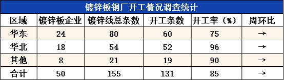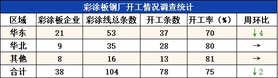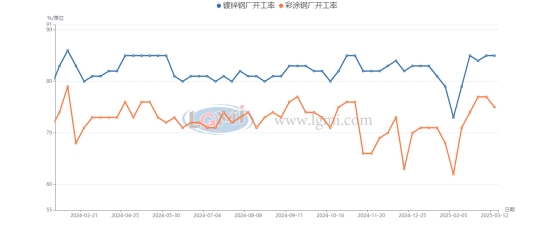 兰格调研:截至3月12日,我网对全国53家钢厂样本进行统计。其中镀锌板生产线共155条,停产或检修24条,开工率为85%,较上期持平,样本数据日均总产量镀锌板9.76万吨,较上期持平。彩涂板生产线共104条,停产或检修26条,开工率为75%,较上期下降2%,样本数据日均总产量彩涂板3.22万吨,较上期减少0.08万吨。