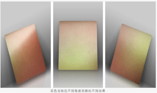 天津新宇以科技为基底,以钢板为语言,用变色龙彩涂板,焕发设计师的无限灵感。新宇变色龙板是在钢板表面涂覆独特绚丽的幻彩涂层,使得钢板在不同角度下,呈现出不同的颜色,还可通过变换不同颜色的涂层,组成无限幻彩效果。
