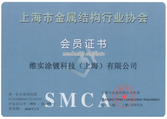 2025 年 5 月,维实涂镀科技(上海)有限公司正式加入上海市金属结构行业协会,成为其会员单位。这一重要里程碑标志着维实的专业能力和行业影响力获得权威机构认可,未来将与协会携手推动金属结构行业的高质量发展。