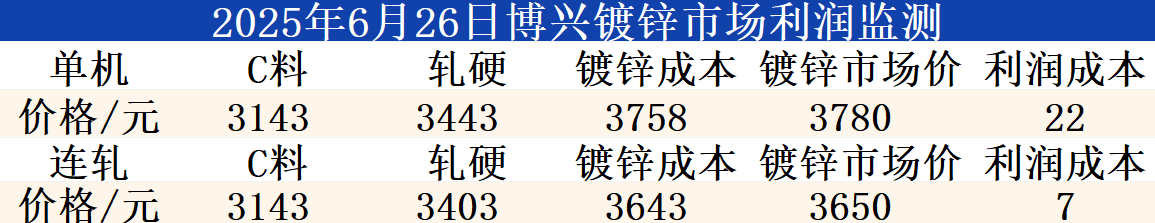 6月26日博兴镀锌市场利润监测