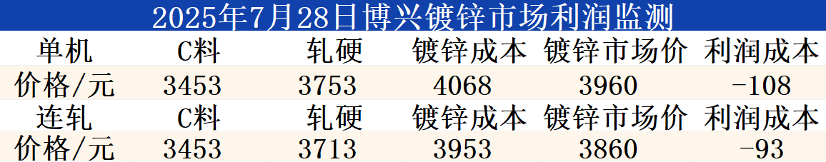 7月28日博兴镀锌市场利润监测
