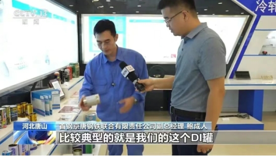 首钢京唐以“蝉翼钢”锻造的蛇年邮票,正是首钢极薄镀锡板技术的艺术化身——其厚度最薄可达0.07毫米,仅相当于一根头发丝直径,却承载着钢铁工业的精密极限。该材料可用于5G基站、新能源电池中枢等高端电子设备。因兼具超薄强度与柔韧特性,衍生出了明信片、邮票、高校录取通知书等钢铁文创精品。此外,这种钢材产品还广泛应用在我们的日常生活中。首钢京唐副总经理鲍成人介绍,大家经常喝的这些食品饮料罐,都是用镀锡板做成的。比较典型的DI罐,薄薄的一个圆片经过“深冲拉拔”制成罐,延伸率最高达到60%,体现了钢铁的高延展性和冶金的高纯净度。