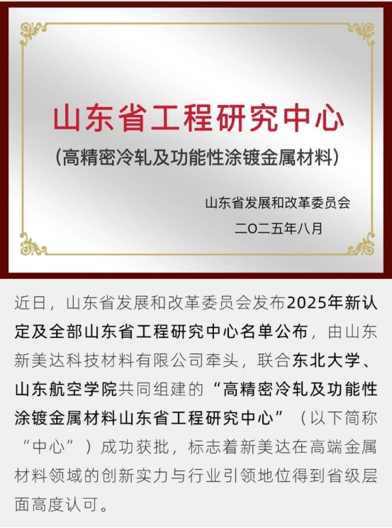 新·动态|新美达获批“高精密冷轧及功能性涂镀金属材料山东省工程研究中心”