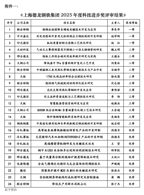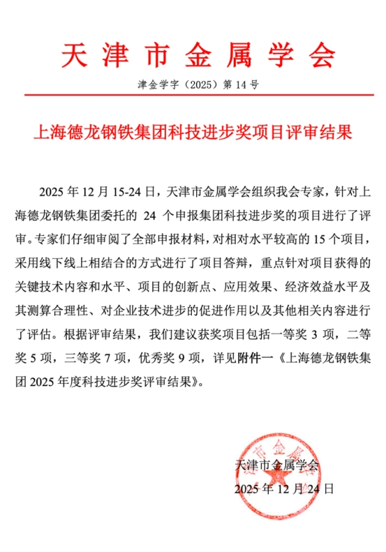 近日,2025年度德龙钢铁集团科技进步奖评审工作顺利完成。本次评审由集团专家委员会委托天津市金属学会组织,邀请多位行业权威专家组成评审团,对集团下属公司申报的24项课题进行了全面、严格的评审。评审工作自12月15日启动,历时10天,于12月24日圆满完成。