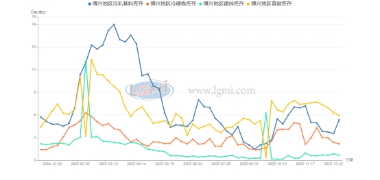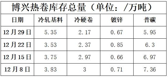 据兰格云商平台监测数据显示,截止12月29日博兴各仓库冷轧基料库存约为5.35万吨,较上期增加1.82万吨;冷硬卷库存2.17万吨,较上期减少0.20吨。