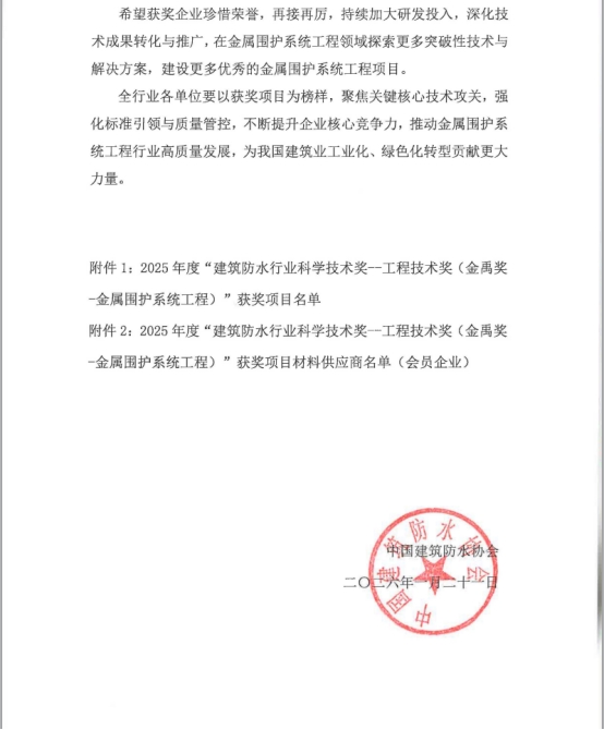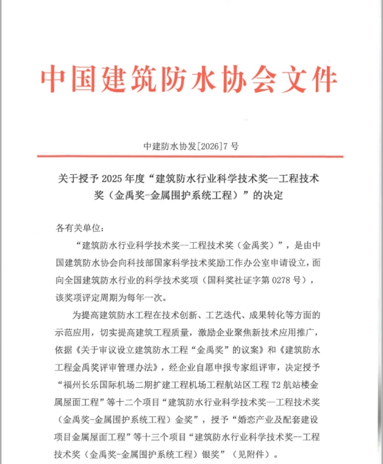 日前,中国建筑防水协会发布文件《关于授予2025年度“建筑防水行业科学技术奖——工程技术奖(金禹奖-金属围护系统工程)”的决定》(中建防水协发[2026]7号),公布了2025年度金禹奖获奖项目名单和材料供应商名单,号召全行业各单位以获奖项目为榜样,聚焦关键核心技术攻关,强化标准引领与质量管控,不断提升企业核心竞争力,推动行业高质量发展,为我国建筑业工业化、绿色化转型贡献更大力量。