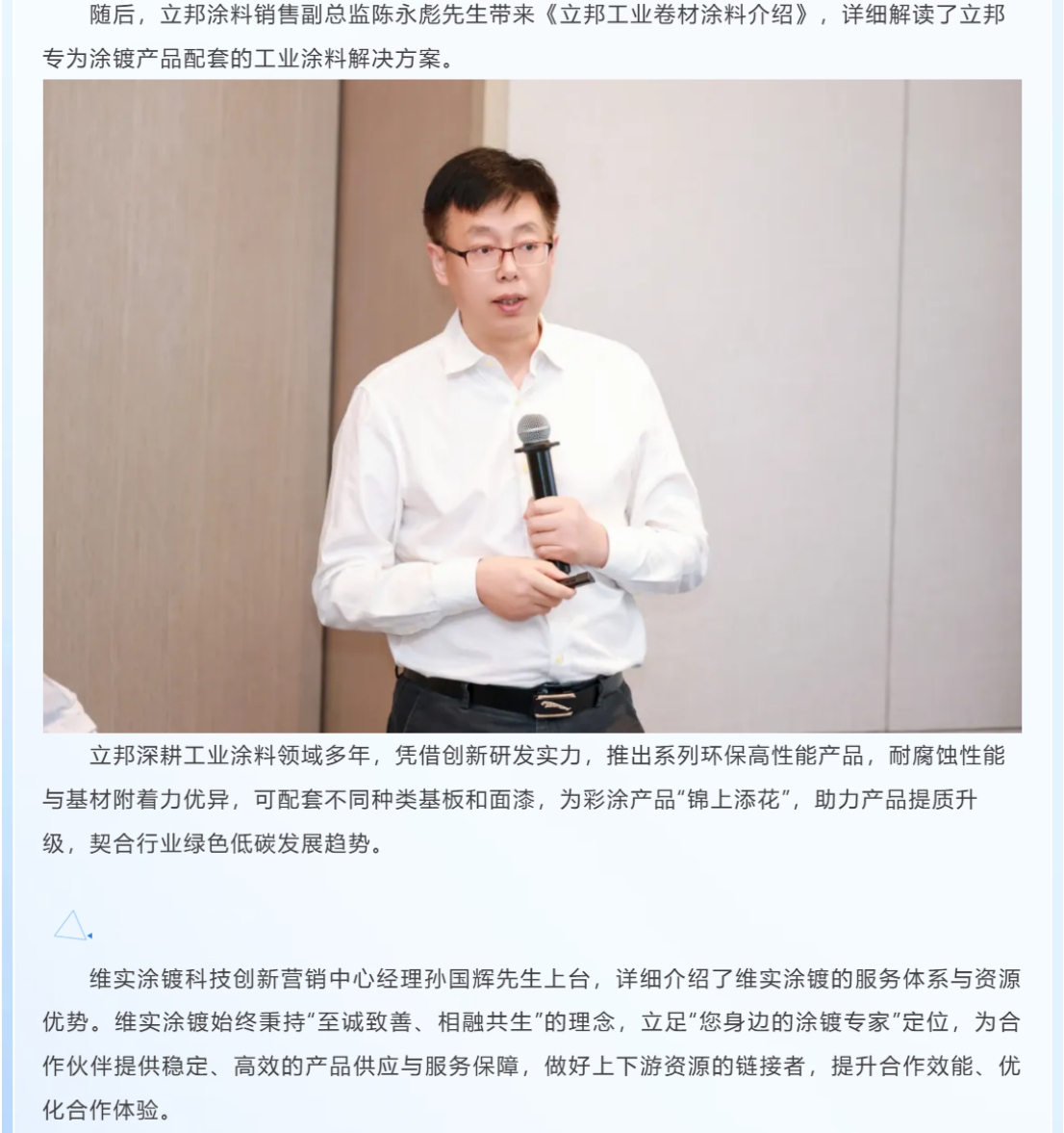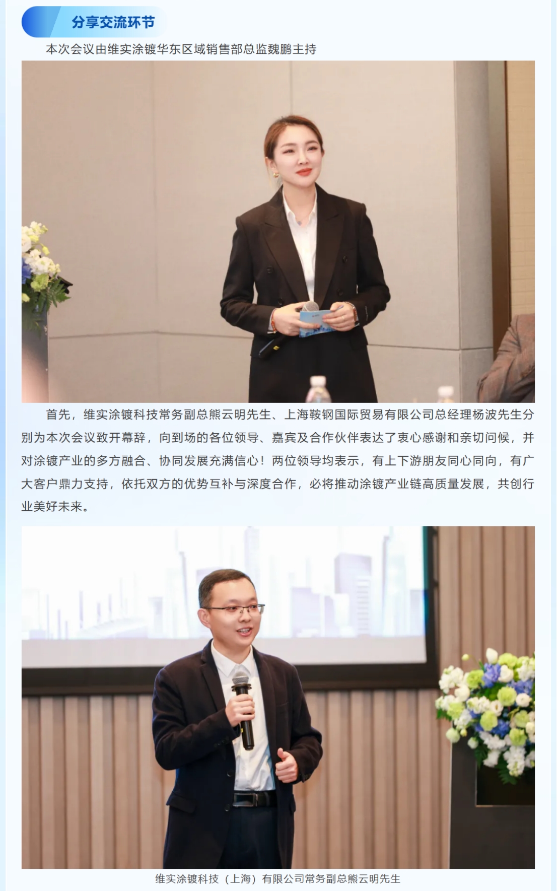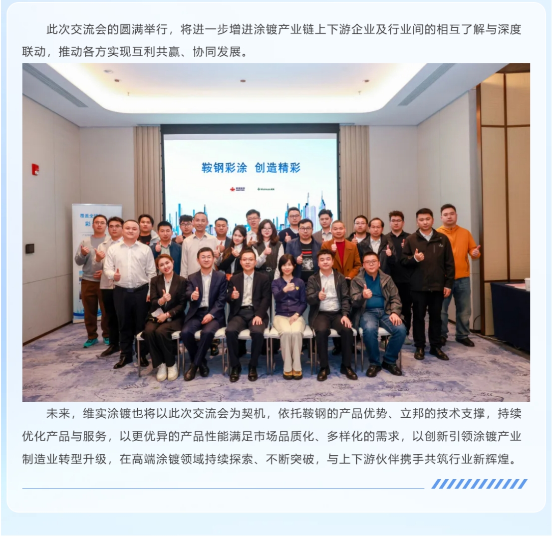 2026 年 4 月 15 日,维实涂镀科技联合鞍钢举办 “鞍钢彩涂,创造精彩” 主题交流会,诚邀涂镀产业链合作伙伴欢聚一堂,通过干货分享、互动答疑、自由交流等环节,搭建起上下游高效协同的合作桥梁,凝聚行业合力,共探涂镀产业高质量发展新路径、共绘行业发展新蓝图。